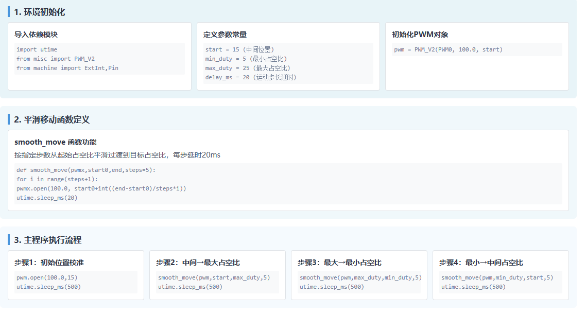 3.硬件极简:无需额外搭载专业舵机控制板,基于模组本身的 PWM_V2 驱动及少量外围配件(如 舵机、杜邦线)即可实现舵机平滑运动,降低硬件搭建成本与复杂度。