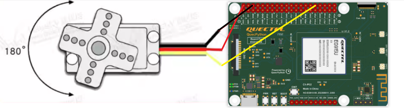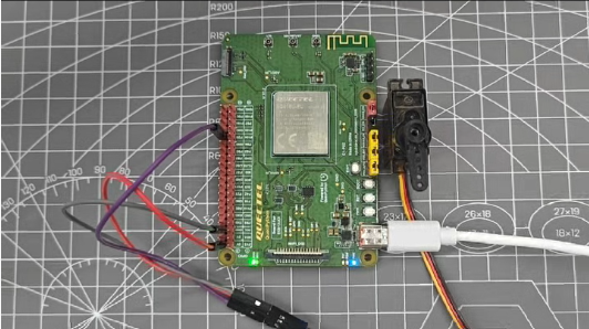 基于 EG915UEUAB 模组完成硬件适配与程序烧录后,可实现开发板驱动舵机,支持基础的控制占空比和旋转角度等核心操作,在低功耗、小体积的物联网硬件环境下实现,无需复杂的外围设备,极简硬件搭配即可完成功能落地。