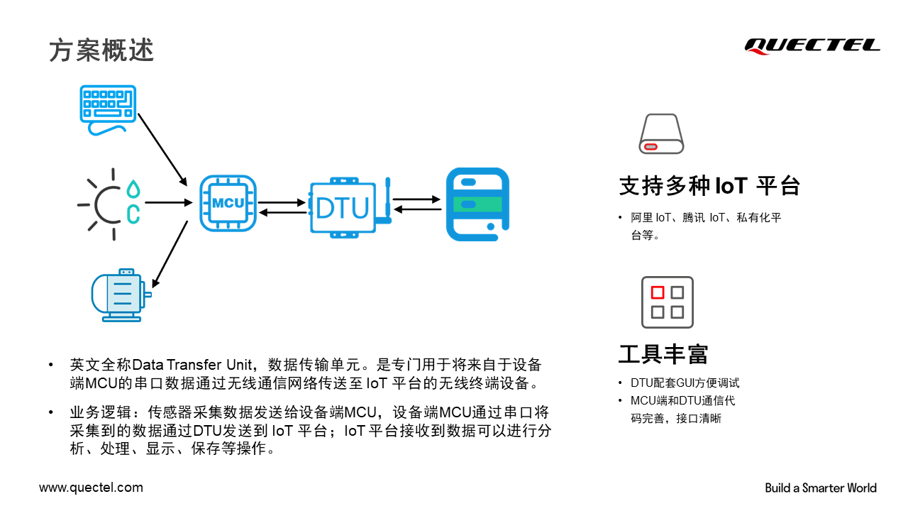 DTU(Data Transfer Unit)是专门用于将来自于设备端的串口数据通过无线通信网络传送至 IoT 平台的无线终端设备